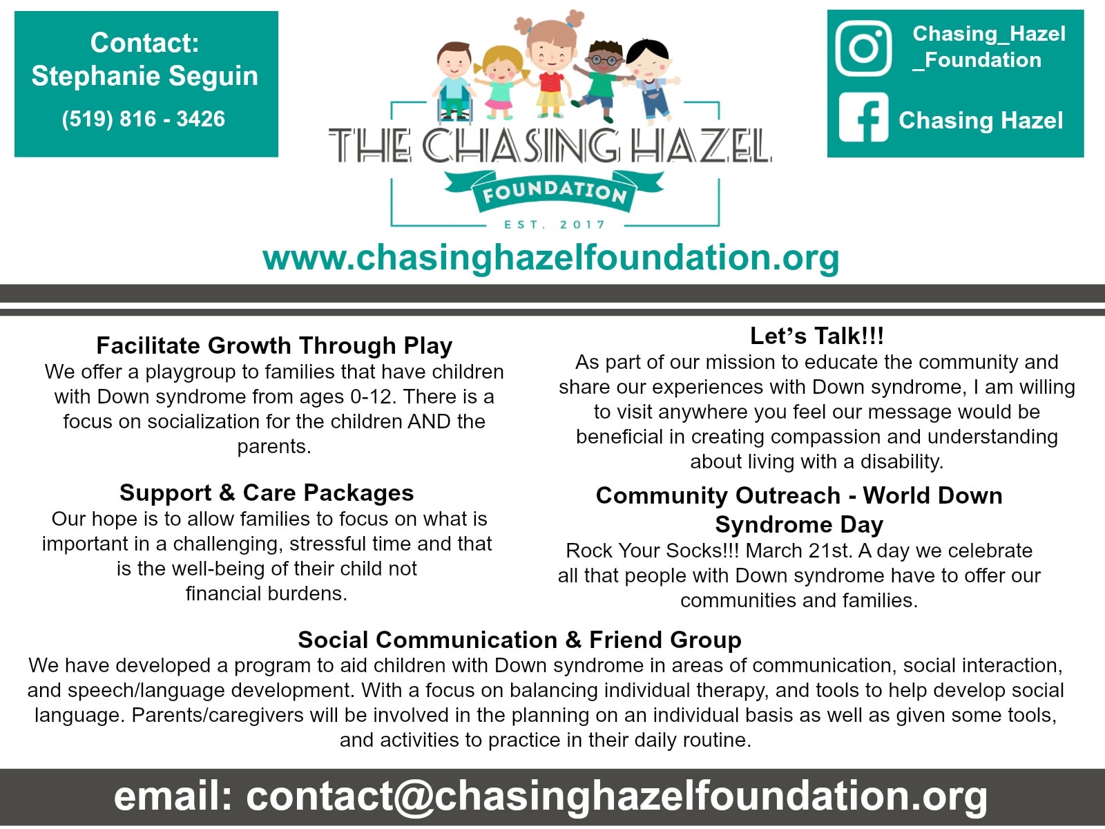 In recognition of World Down Syndrome Day on March 21, we will be selling funky socks for you and your families to wear! All the proceeds go to the Chasing Hazel Foundation which provide families with the support and care packages they need during stressful and challenging times. The Chasing Hazel Foundation organizes play groups for children with Down syndrome ages 0-12. They partake in events to help educate the community on Down Syndrome and have developed a program to aid children with Down Syndrome in the areas of communication, social interaction and speech/language development.